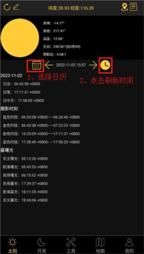 1¡¢½øÈëÈÕ³öÈÕÂäÔÂÏàappµÄÌ«ÑôÒ³Ãæ£¬ÏµÍ³×Ô¶¯Æ¾Ö¤ÊÖ»ú¶¨Î»ÅÌËãÈÕ³öÈÕÂäʱ¼ä¡£ÈçÐèÐÞ¸ÄλÖ㬵ã»÷µØÀíͼ±ê£¨ÏÂͼºìÉ«¼ýÍ·ËùÖ¸£©ÊäÈë¾Î³¶È»òµØÃû