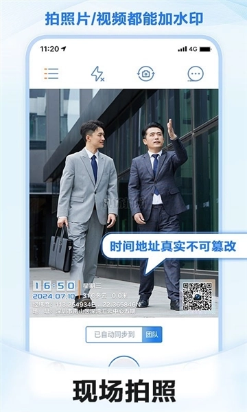 支持现场拍摄或视频实时添加,地点与时间信息不可修改,经纬度、海拔、天气、IMEI、手机号等水印内容支持自界说设置。