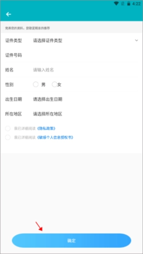 Õâʱ¼äÐèÒªÌîдÉí·ÝÖ¤ÉϵÄÏêϸÐÅÏ¢£¬ºÃ±ÈÖ¤¼þÀàÐÍ¡¢ÐÕÃû¡¢ËùÔÚµØÇøµÈ£¬¹´Ñ¡Ï·½µÄÒþ˽Õþ²ßºÍСÎÒ˽¼ÒÐÅÏ¢ÊÚȨÊ飬Ȼºóµã»÷È·¶¨¡£